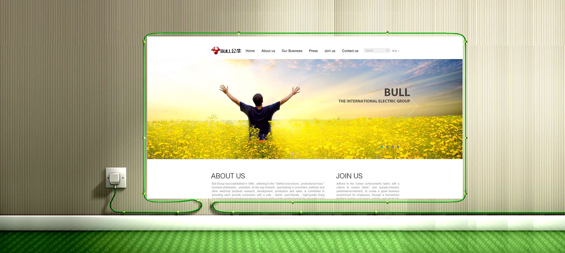 因脉旨哉为公牛打造线上集团形象,加深用户对公牛集团的品牌印象,进而展现产品特点。英文官网与中文站采用不同的设计风格,遵从国外网站简洁、大气的设计理念,Metro风格的大色块拼接、简洁的扁平化风格,国际化、让人舒适且智能的与公牛集团理念相响应,从细节配色、体验式交互等多方位进行展现。